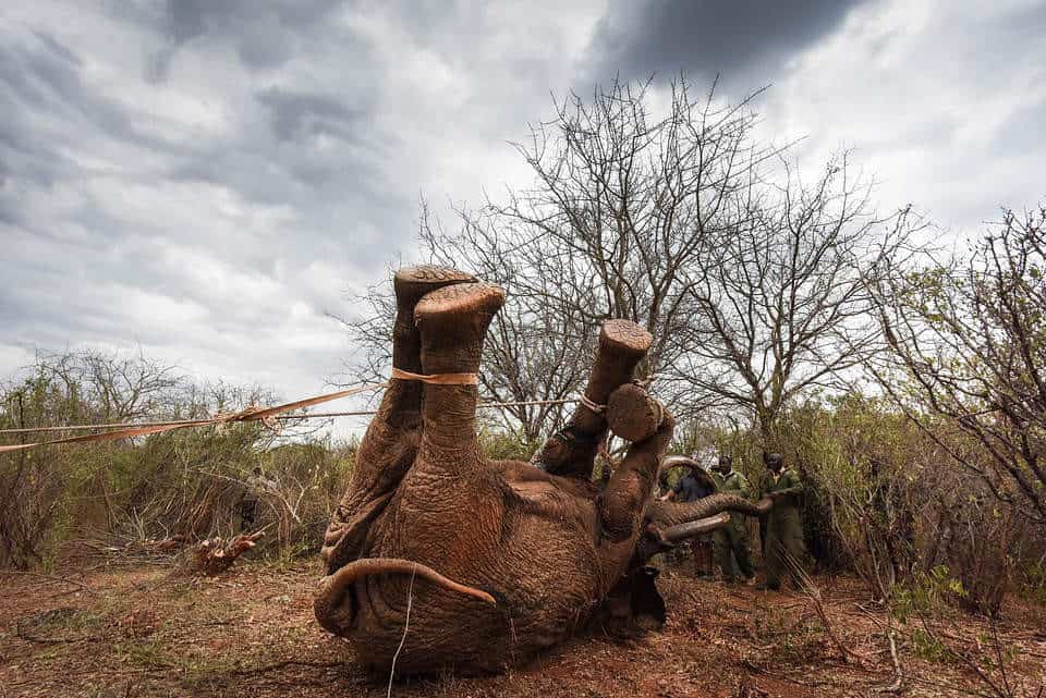 The wounded elephant then needed to be flipped onto its opposite side, which was achieved by securing ropes around its legs and using a grader to assess.